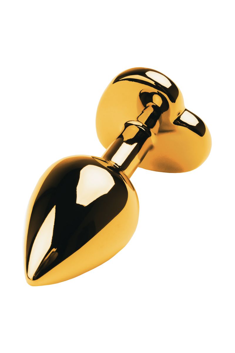 Золотистая анальная втулка из легкого сплава ощутима по форме, но комфортна по весу. Страз в форме сердечка украсит ваши игры.