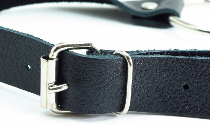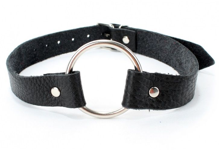 Черный кожаный кляп с кольцом. Застегивается сзади на пряжку.
