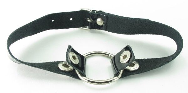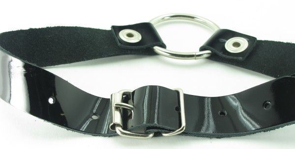 Кляп в виде открытого кольца на лаковом ремешке, изготовленном из качественной кожи. Для регулировки длины кляпа на ремешке имеется 6 отверстий. Ширина ремешка - 2 см. Диаметр кольца - 4,5 см.