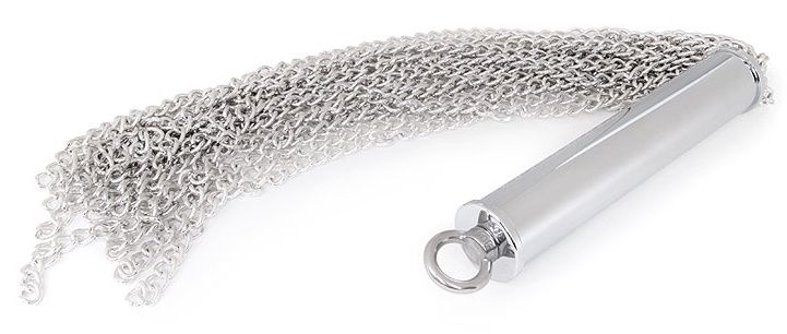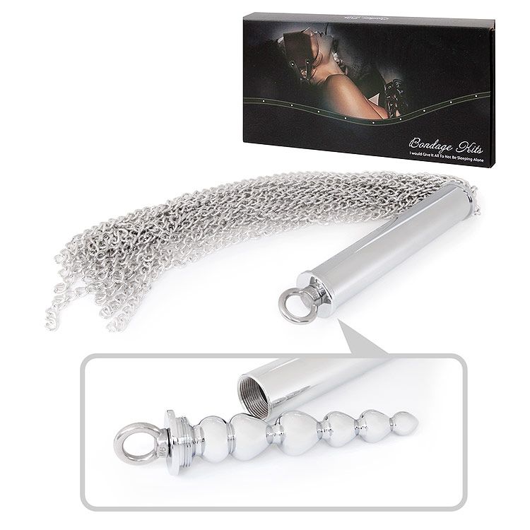 Оригинальный БДСМ-аксессуар – металлическая плеть-флогер и металлическая втулка в форме ёлочки. Плеть имеет длинные хвосты-цепи, закреплённые на специальном держателе, который, при необходимости, выкручивается из рукоятки вместе с цепями. Втулка также может выкручивается из рукоятки. Для удобства она оснащена ручкой-кольцом. Изделие используется соло, в паре или как элемент в БДСМ-игре при подготовке к анальному сексу или для достижения сексуального удовольствия. Секс-игрушка имеет современный дизайн в стиле хай-тек, изготовлена из качественного материала, проста в использовании и уходе. Длина рукояти - 16,5 см. Длина втулки - 12,5 см., диаметр - 2,5 см.