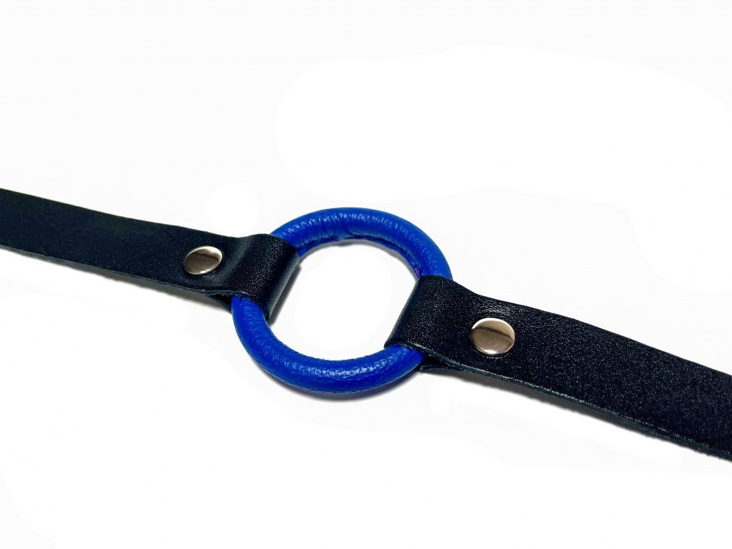 Строгий и надежный кляп, выполненный из натуральной кожи черного цвета. В основании использовано сварное металлическое кольцо, обтянутое нежной овечьей кожей синего цвета. Обхват удобно регулируется с помощью металлической пряжки. Такой кляп станет отличным элементом БДСМ игры, функциональным и комфортным в использовании. Диаметр кольца - 4,5 см. Ширина ремешков - 1,8 см.
