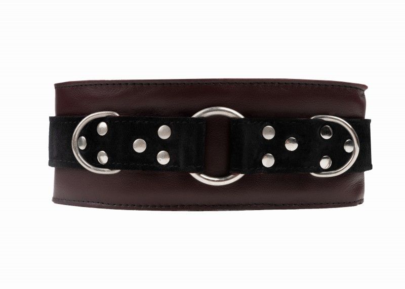 Ошейник выполнен из натуральной кожи бордового цвета, декорирован вставкой из черной замши, заклепками, металлическим кольцом и двумя полукольцами. Ремень с пряжкой позволяет выбрать нужный размер. Внутренняя замшевая подкладка мягкая, черного цвета не доставит неприятных ощущений, благодаря тому что вся металлическая фурнитура спрятана за ней. Обхват шеи - 37-48 см. Ширина ошейника - 7 см.