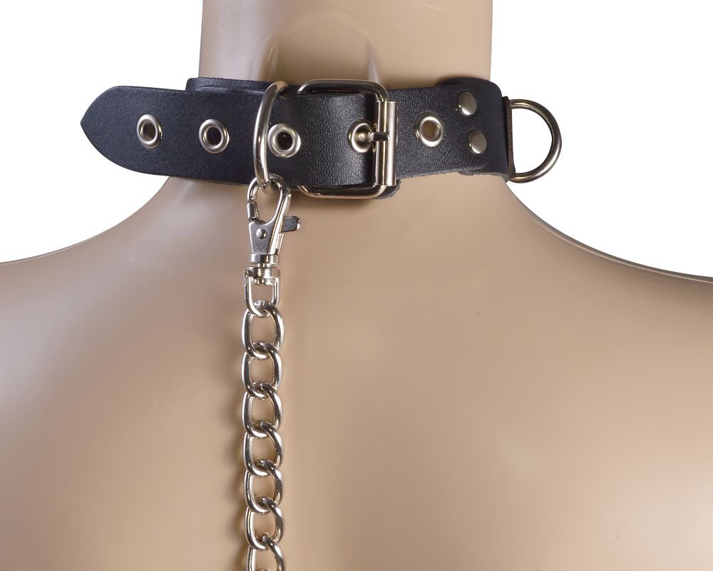 Ошейник изготовлен из натуральной кожи. Регулируется при помощи пряжки. В комплект входит поводок-цепочка. Фурнитура имеет никелевое покрытие. Длина поводка - 100 см.