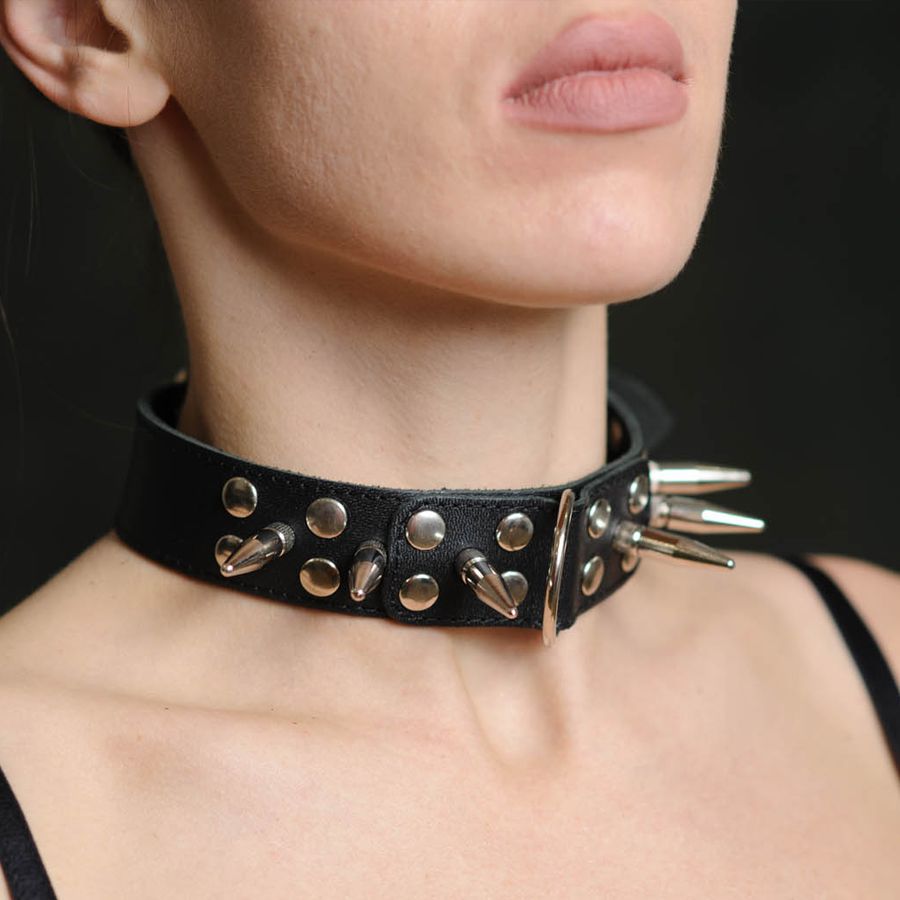 Изготовлен из натуральной кожи с велюровой подкладой. При изготовлении использована никелированная фурнитура. Один из основных атрибутов BDSM. Ширина ошейника - 3 см. Длина шипов - 2,5 см. Длина цепочки (поводка) с карабином - 50 см.
