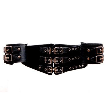 Данный бондажный комплект изготовлен из натуральной кожи черного цвета.Состоит комплект из жесткого пояса и наручей, фиксирующих руки. Регулировка размера пояса осуществляется ремнями спереди и сзади. Минимальный размер пояса - 74 см., максимальный - 100 см.