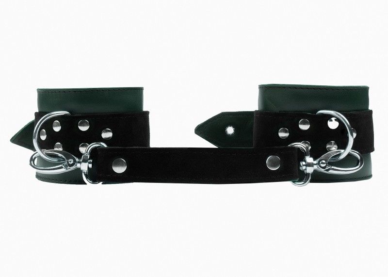 Наручники выполнены из натуральной кожи. Изделие декорировано ремнями из замши. Посредине наручника расположено полукольцо из сварной фурнитуры. Наручники надежно фиксируются пряжками и ремнями, позволяющими выбрать нужный размер, кожаное соединение на карабинах фиксирует наручники вместе. Стильные наручники отлично подходят для воплощения эротических БДСМ игр. Внутренняя подкладка мягкая, не доставит неприятных ощущений, благодаря тому что вся металлическая фурнитура спрятана за ней. За счёт карабинов легко разъединяются и быстро застёгиваются. Подойдут как для новичков, так и для профессионалов. Ширина наручников - 6 см., ремешка - 3 см. Обхват - 24 см.