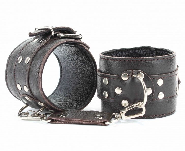 Черные кожаные наручники на металлической цепочке. Выполнены с заклепками из металла.