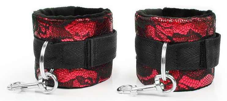 Оригинальные наручники для любителей нестандартных эротических забав. Внешняя поверхность изделий украшена кружевом, внутренняя имеет мягкую бархатистую прокладку, которая препятствует натиранию кожи. Наручники снабжены карабинами, благодаря которым изделия можно соединять между собой. На запястьях наручники закрепляются с помощью липучек. Интимные аксессуары просты в использовании, не требуют специального ухода.