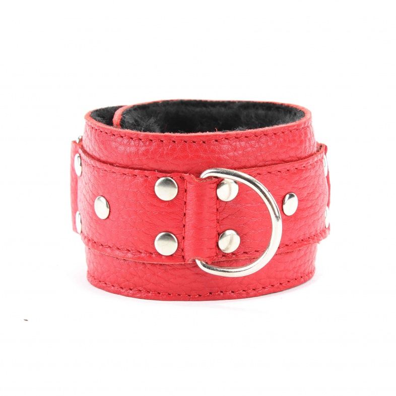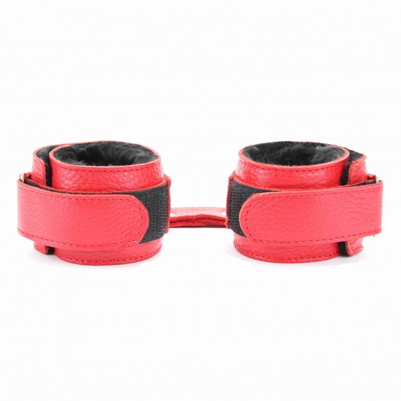 Кожаные наручники красного цвета. Украшены заклепками и соединяются между собой цепью с карабинами. Внутренняя часть наручников отделана черны мехом. Размер наручников регулируется при помощи застежки-липучки. Ширина - 5 см.