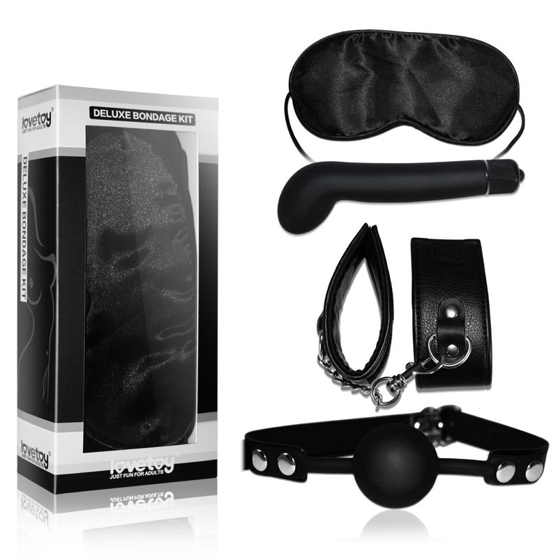 Набор для БДСМ-игр DeLuxe включает в себя силиконовый кляп-шар на регулируемых ремешках, наручники, вибромассажёр с загнутой головкой для стимуляции точки G или простаты, сатиновую маску на глаза на резинке. В комплекте: кляп, вибратор, наручники, маска.