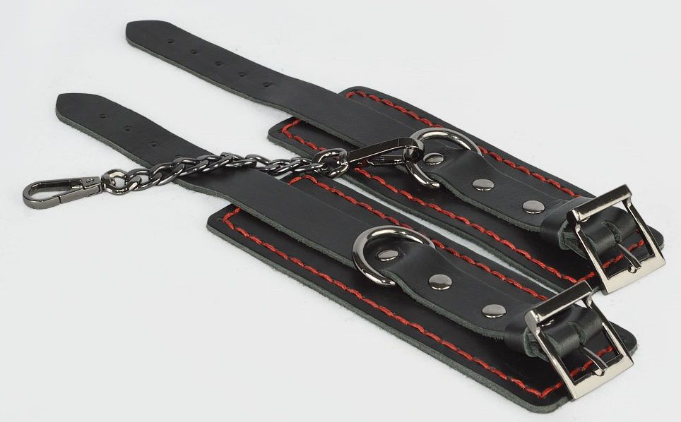 Наручники изготовлены из натуральной кожи и декорированы контрастной строчкой. Регулируются при помощи пряжки. Наручники соединяются цепочкой, на концах которой располагаются карабины.