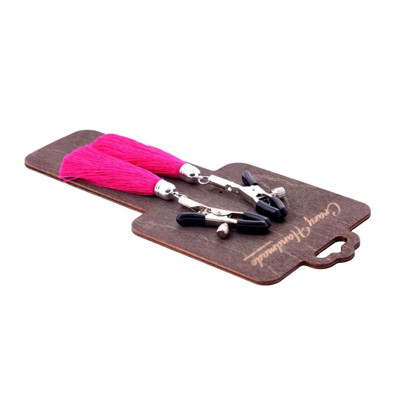 Зажимы мягко сдавливают соски за счет резиновых наконечников, а прикосновения кисточек из шелковых нитей приятно ощущаются на коже. Сила сжатия зажимов регулируется болтиками. Длина кисточки - 8 см.