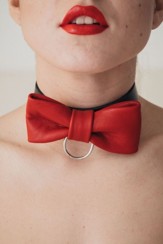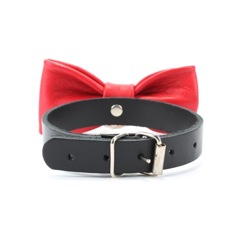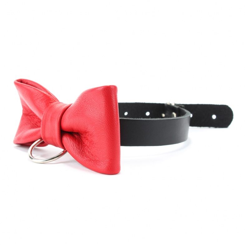 Черный ошейник с красной бабочкой идеально подойдет как для мужчин, так и для женщин. В ошейник вставлено D-кольцо, с которым фетиш-изделие соединяется с бандажом или поводком. Ширина ошейника - 1,5 см., бабочки - 6 см.