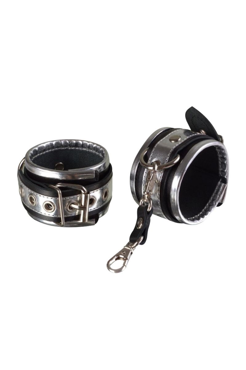 Аксессуар состоит из двух широких полос из плотной натуральной кожи черного цвета с серебряными вставками, соединенных между собой снимающейся короткой сцепкой в виде карабинов. По краю наручников проходит оторочка, обеспечивающая комфорт при ношении. Ширина - 5,3 см.