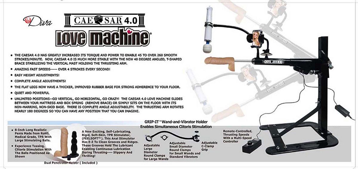 Секс-машина Цезарь 4.0. Работает от сети 220V. Частота проникновений - до 260 в минуту. Угол наклона меняется. В комплекте насадка-фаллос, коннектор на две насадки, чёрная анальная ёлочка, держатель для вибромассажёров (в том числе для Magic Wand), держатель для смартфона. Длина фаллоса - 20 см. Длина анального плага - 17,5 см.