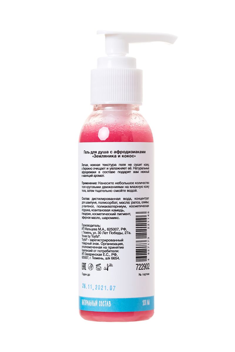 Гель для душа с афродизиаками Страстная земляника. Легкая, нежная текстура геля не сушит кожу, а бережно очищает и увлажняет её. Натуральные афродизиаки в составе подарят вам нежный и манящий аромат. Подготовка к свиданию: Примите душ перед волнующим свиданием. Сладкий аромат земляники с кокосом зарядит романтическим настроем, а действие афродизиаков сделают вас по-особенному желанной для вашего партнера!