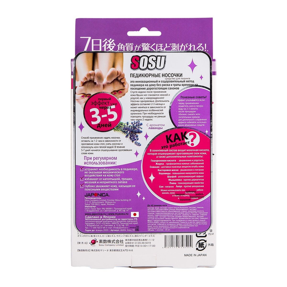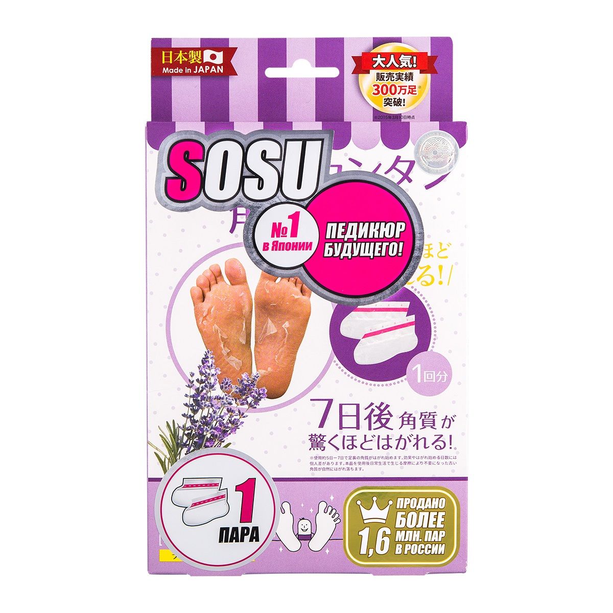 Носочки SOSU - это инновационный способ педикюра на дому без риска и траты времени на посещение дорогостоящих процедур. SOSU – новое слово в косметологии, разработанное японскими специалистами, которое уже по достоинству оценили женщины страны «Восходящего Солнца», вверив самой природе заботу о своих ножках. Основной компонент активного вещества - молочная кислота и растительные экстракты лопуха, лимона, плюща, жерухи, шалфея, мыльнянки и др., стимулирующие естественный процесс отторжения мертвых тканей. Оказывают терапевтическое и эстетическое действие, быстро и безопасно решают косметологические проблемы стоп. Кожа становится гладкой и упругой, сохраняя эффект в течение долгого времени.