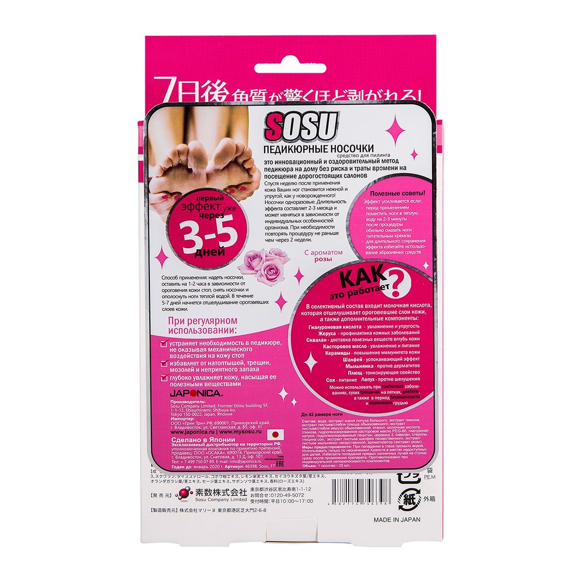 Носочки SOSU - это инновационный способ педикюра на дому без риска и траты времени на посещение дорогостоящих процедур. SOSU – новое слово в косметологии, разработанное японскими специалистами, которое уже по достоинству оценили женщины страны «Восходящего Солнца», вверив самой природе заботу о своих ножках. Основной компонент активного вещества - молочная кислота и растительные экстракты лопуха, лимона, плюща, жерухи, шалфея, мыльнянки и др., стимулирующие естественный процесс отторжения мертвых тканей. Оказывают терапевтическое и эстетическое действие, быстро и безопасно решают косметологические проблемы стоп. Кожа становится гладкой и упругой, сохраняя эффект в течение долгого времени.