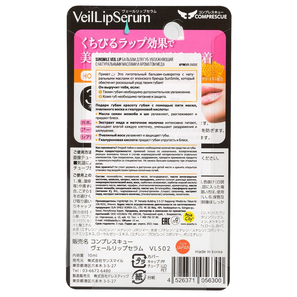 Увлажняющий бальзам-сыворотка с натуральными маслами от японского бренда SunSmile, который обеспечит роскошный уход твоим губам! Подари губам красоту с помощью пяти масел, пчелиного воска и гиалуроновой кислоты:Увлажняет, разглаживает и придает блеск. Придает губам упругость и блеск, увлажняя их. Приятный сладкий аромат меда на губах поднимает настроение!