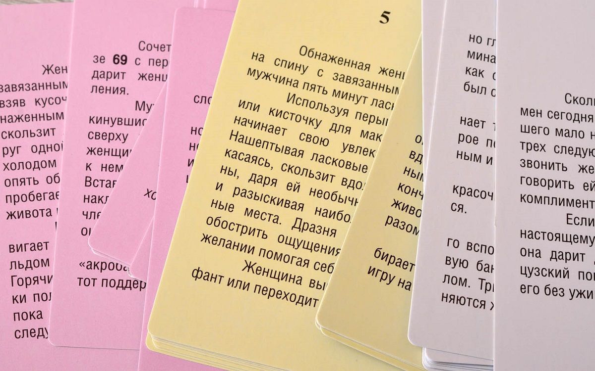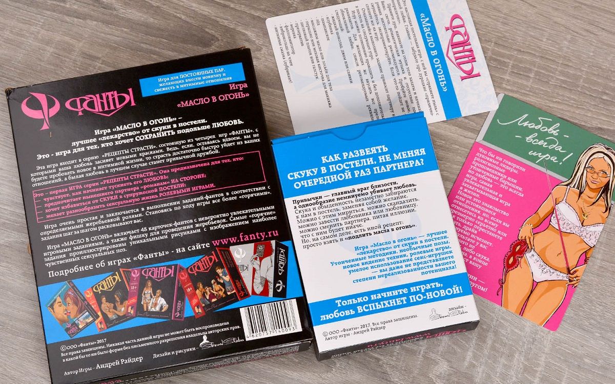 Клубника пригодится Обладателю этих фантов придется пережить самый страстный период в своей жизни. Вместе с любимым человеком, конечно. Клубника и мед, шоколад и шелк, поэзия и свечи, нежность и грубость — в этих фантах есть все. И еще неизвестно, что круче: выполнять эротичные задания или наслаждаться тем, как их выполняет любимый человек. Хватит больше, чем на 9 с половиной недель Длину эротического приключения вместе с фантами «Масло в огонь» определяете только вы. Можно растянуть удовольствие, можно, наоборот, с энтузиазмом взяться за дело, проводя новые эксперименты каждую ночь. В любом случае вам обеспечена не одна неделя приятных сюрпризов. Распаковывайте коробку, выбирайте уровень и начинайте получать удовольствие... А красная комната понадобится? Фанты специально поделены на несколько категорий: вы самостоятельно определяете, на что готовы. Белые фанты: самые безобидные и романтичные. Легкие заигрывания, романтика и немного эротики. С них и стоит начать. Желтые фанты уже горячее. Здесь вы уже станете намного ближе. И доставите друг другу массу удовольствия самыми разнообразными способами. Правда, по-настоящему «сексуальных» заданий здесь все еще нет. Розовые фанты предложат немного пофантазировать. И поиграть. Не в доминирование. Красные фанты понравятся тем, кто не боится рисковать. Они точно привнесут в сексуальную жизнь новизну. Запаситесь реквизитом заранее Острота переживаний напрямую зависит от того, насколько серьезно вы подойдете к процессу. Для выполнения многих заданий вам понадобятся реквизит, который совсем нетрудно достать. Классика жанра: шампанское, свечи, горячий шоколад, мед, массажное масло, розы, веревка... В целом, легко догадаться, как распорядиться всем этим. Но ведь интересно, что придумал автор фантов... Кому этот набор действительно пригодится Молодой паре, которая хочет постепенно узнавать друг друга ближе. И также постепенно расставаться с комплексами. Искушенным партнерам, готовым к новым экспериментам. Для них игра станет веселым приключением, полным сюрпризов: никто не знает, какое задание выпадет сегодня вечером...Супружеской паре, которой хочется вспомнить страстное начало отношений. Новые ситуации заставят посмотреть друг на друга новыми глазами. И узнать о новых, неизведанных ранее, гранях сексуальной жизни.