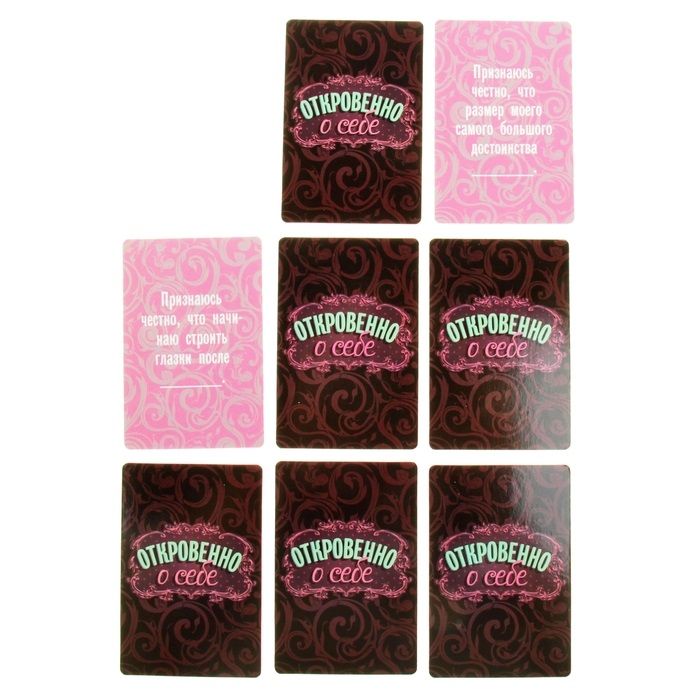 Признаюсь честно, что… Что игра «Откровенно о себе» позволит вам узнать множество интересных и пикантных деталей, возможно, которых вы друг о друге еще не знали. Для тех, кто готов к откровениям. Правила игры предельно просты, игроки по очереди вытягивают карточки с заданиями и отвечают на них предельно откровенно. Кто знает, куда вас заведет этот вечер. Признавайтесь, делитесь, играйте!