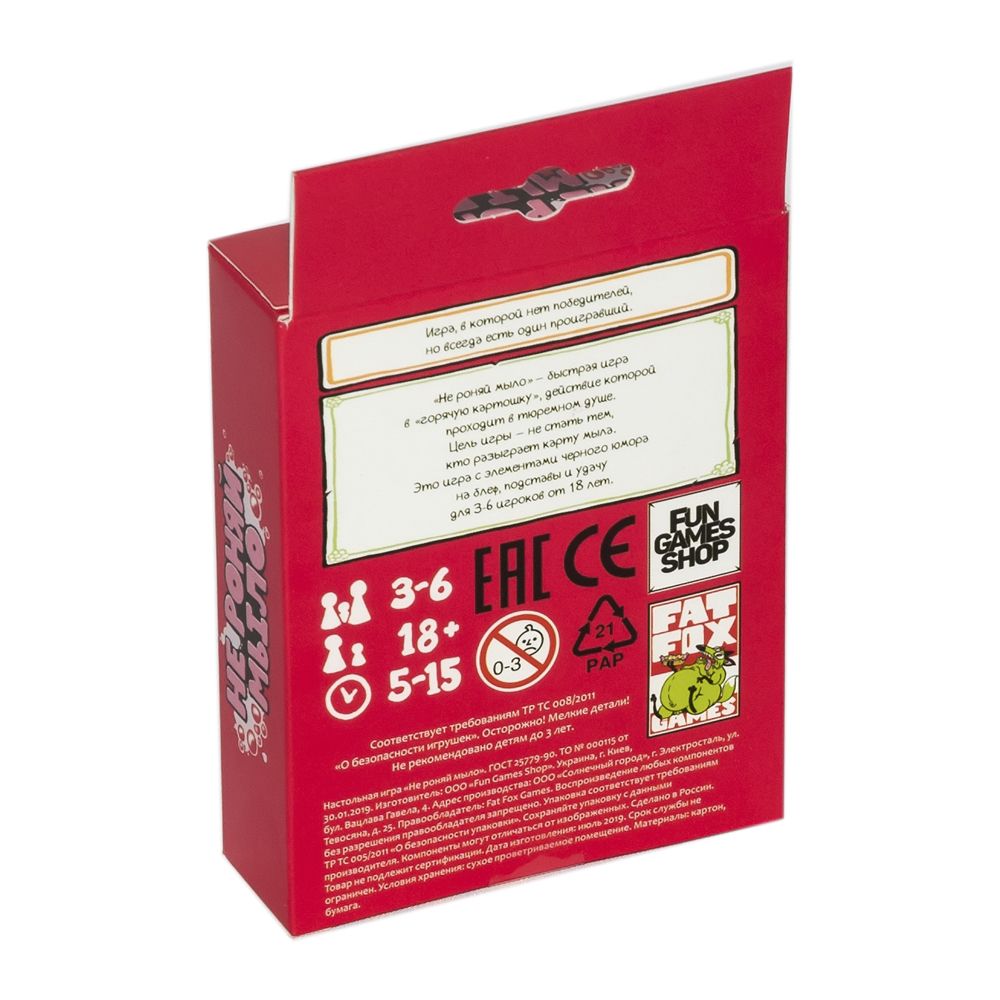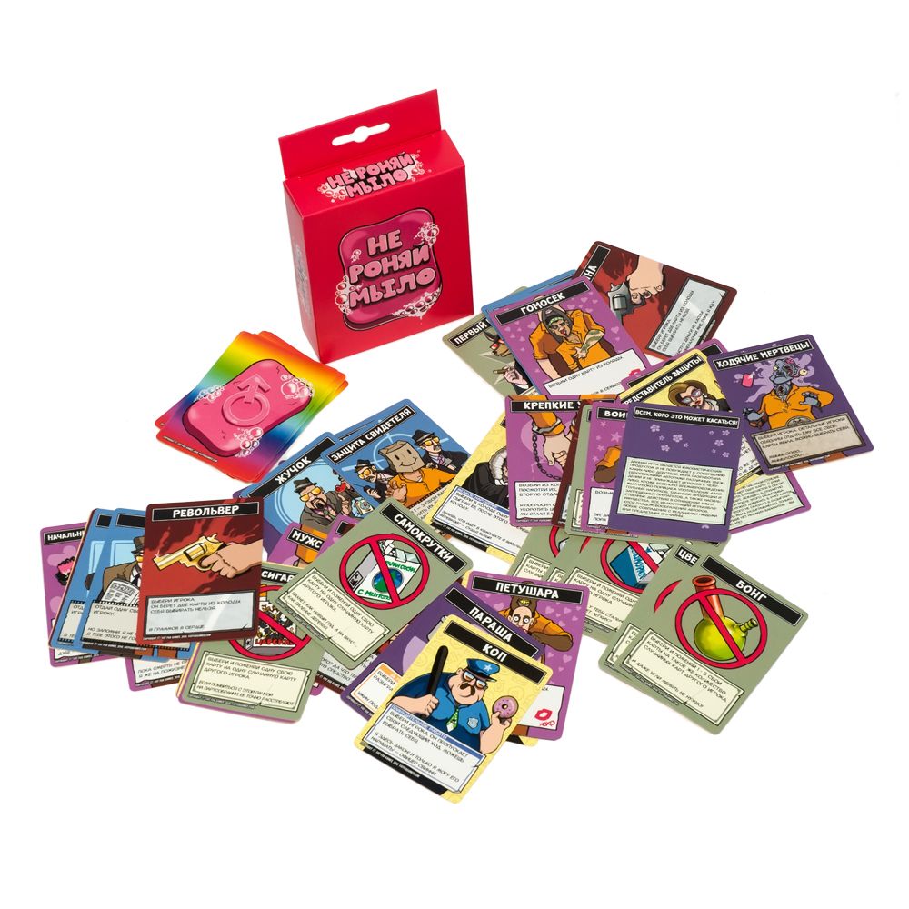 Вечер в хату, часик в радость! Предлагаем поиграть в карточную игра для 3-6 братанов, но не «очко». Она гораздо веселее, потому что здесь в опасности именно ваше очко. Самое рискованное дело в очередной ходке за решетку – не пахана разозлить, а мыло в душевой уронить! Именно этого вам ни в коем случае нельзя допустить в игре «Не роняй мыло!». Все, что надо делать – каждый ход играть одну-единственную карту. Но горе вам, если, кроме мыла, бросать на стол больше нечего. Ведь в этой игре будет только один проигравший… К счастью, не стать опущенным могут помочь другие карты. Направьте на кого-то оружие, позовите на помощь охранника или адвоката. Оттянуть неизбежное может помочь нелегально пронесенное курево (интересно, в каком месте вы его спрятали, отправляясь в душ?). Ну а если вариантов больше совсем нет, может спасти карта «Я не против, милый» (один раз не… сами понимаете). «Не роняй мыло!» - веселая игра на 5-15 минут, которая подойдет компаниям с определенным чувством юмора. Вы точно не сможете молча шлепать на стол карты с серьезным выражением лица – игровой процесс будет сопровождаться сальными шуточками, едкими комментариями и взрывами хохота. Это начнется уже на этапе подготовки (первое мыло правила приказывают вручить игроку с самой клевой задницей), и продолжится на протяжении всей партии. Повод к этому дарит каждая карта: они снабжены не только названием, знакомящим вас с тюремным жаргоном и забавной иллюстрацией, но и цитатами с воровскими премудростями. В общем, хватит базарить и понты гнать! Помойтесь, как авторитеты, без зашквара, а то не ровен час и в петушару превратиться!