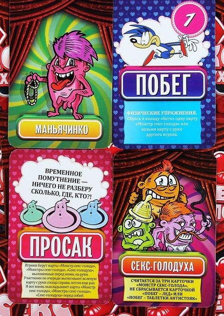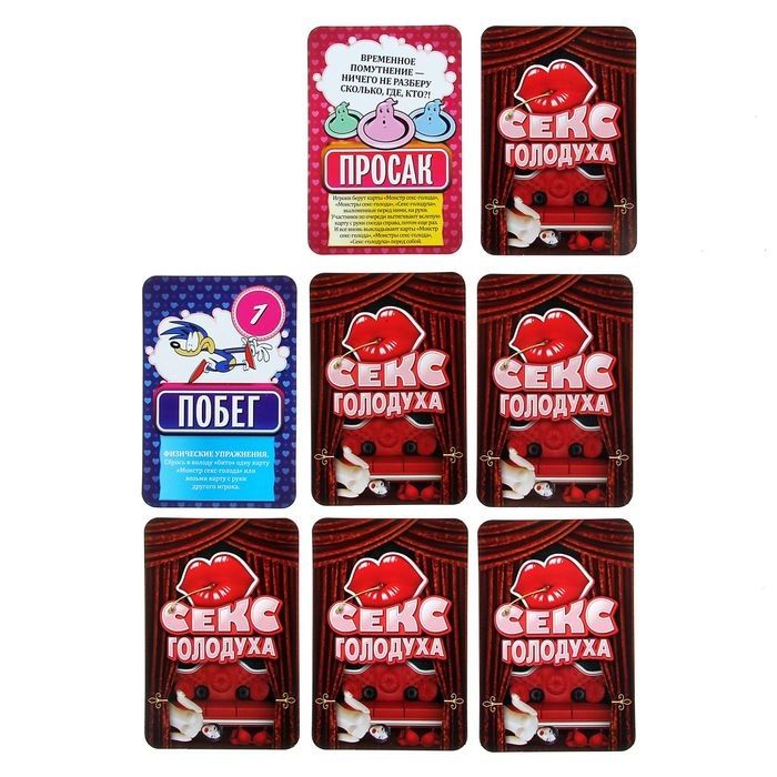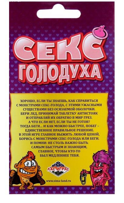 С невероятной игрой «Секс-голодуха» ты почувствуешь себя главным героем блокбастера. Воспользуйся шансом, вырвись из сетей монстров секс-голода! Динамичная игра для веселой компании, которой не страшна секс-голодуха. Играйте вдвоем или небольшой компанией до 5 человек. Карточки с разным значением и заданиями помогут вам побороть секс-монстров и скорее сбежать от этого ужаса. У вас есть 3 раунда, чтобы собрать больше всего очков «побега» и стать героем секс-апокалипсиса. Но знайте, что секс-монстры поджидают на каждом углу! В комплекте: 61 карточка 5 карточек для подсчета очков 1 маркер правила игры.