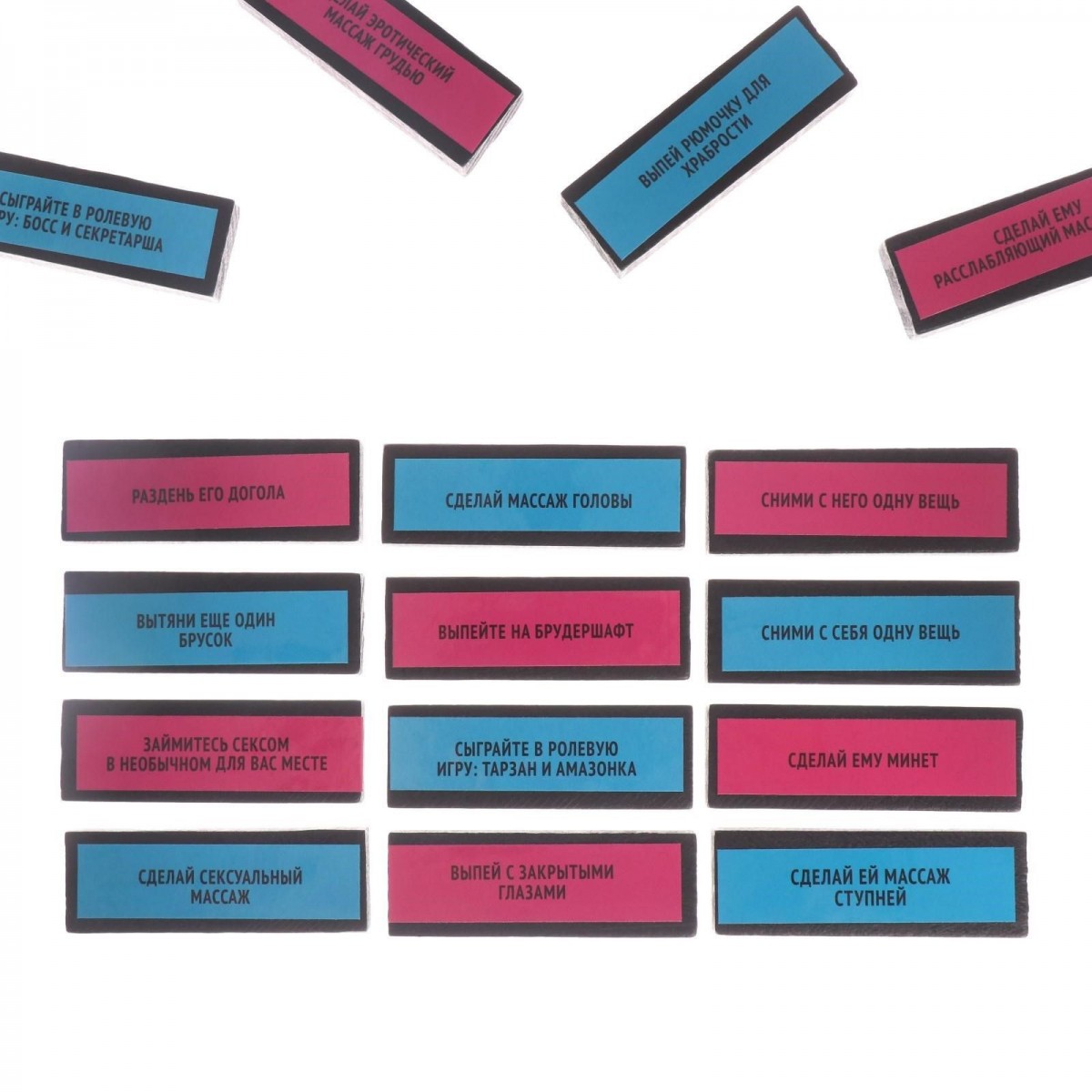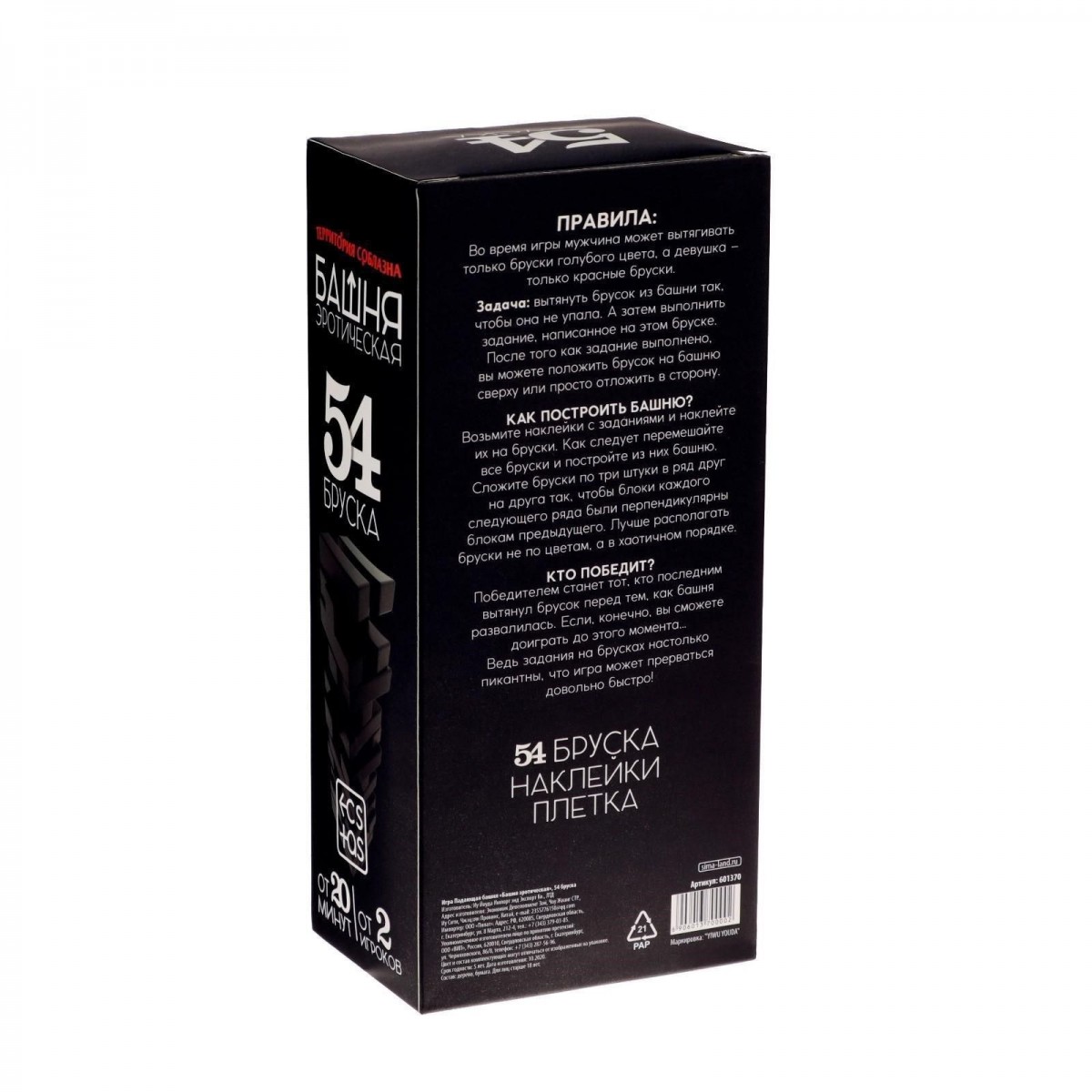 Хотите провести время вдвоем, да еще так, чтобы вечер прошел незабываемо и запомнился надолго? Попробуйте поиграть в Эротическую башню! В вашем распоряжении 57 деревянных брусков, которые необходимо выкладывать по три перпендикулярно друг другу. Что в итоге получилось? Верно, башня! Ну а теперь, самое интересное. Мужчина вытягивает из башни только голубые бруски, ну а дама – только красные. Зачитывайте задание с вытащенного бруска и выполняйте его. Страстные поцелуи, нежные поглаживания и даже ролевые игры. Ну а плетка, станет отличным дополнением к вашим играм.