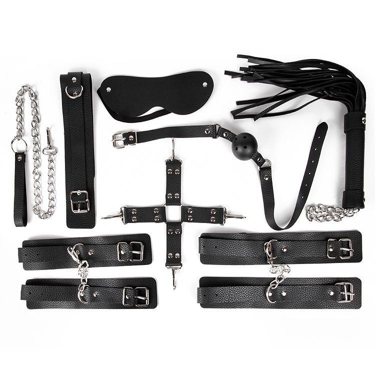 Великолепный набор аксессуаров для любителей БДСМ. В комплект входят наручники, оковы, ошейник с цепочкой-поводком, фиксатор, плеть, кляп, маска. Кляп, наручники, оковы, ошейник и маска снабжены специальной внутренней накладкой, предотвращающей натирание кожи. Также изделия имеют возможность регулирования размера. Плеть-флоггер состоит из хвостов и удобной рукоятки с металлическими вставками и петлёй для подвешивания на крючок. Кляп оснащён шариком с отверстиями для дыхания. Наборы упакованы в большие коробки. Длина хвоста флоггера - 24 см., рукояти - 15 см.