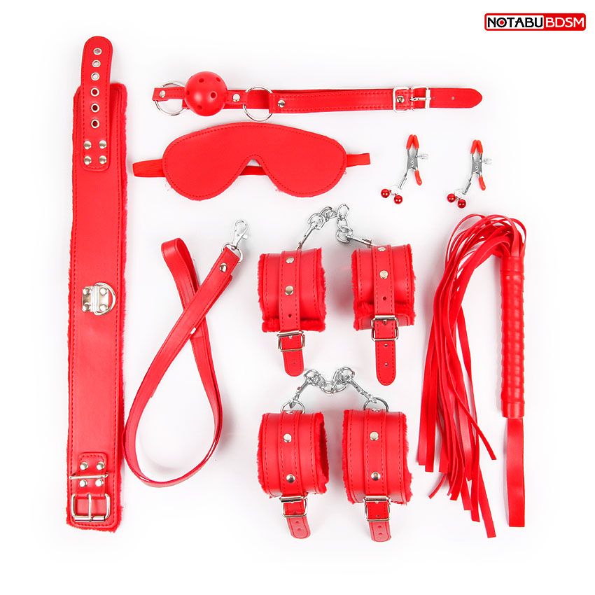Великолепный набор аксессуаров для любителей БДСМ. В комплект входят кляп, наручники, оковы, ошейник, поводок, верёвка, маска, плеть, зажимы для сосков. Кляп состоит из пластмассового шарика с отверстиями для дыхания и ремней с возможностью регулировки размера. Наручники и оковы снабжены металлической цепочкой, которая позволяет скреплять изделия вместе. Внешняя сторона наручников, оков, ошейника и маски выполнена под кожу, внутренняя отделана мехом, который предотвращает натирание кожи. Зажимы для сосков имеют эластичные накладки, которые препятствуют сильному сдавливанию сосков. На каждом изделии предусмотрен регулировочный винт, позволяющий контролировать силу сдавливания сосков. Небольшие подвески украшают зажимы. Плеть-флогер состоит из хвостов и отделанной искусственной кожей рукоятки с петлей. В комплекте: маска, кляп, зажимы, плётка, ошейник, наручники, оковы.