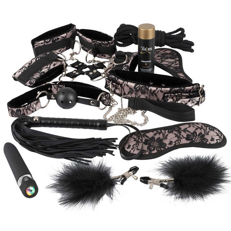 В набор входят крестообразные кандалы для рук и ног, ошейник с поводком, маска для глаз, шлепалка, кляп-шар, многохвостая плетка, зажимы на соски с пуховками, веревка для связывания, классический вибратор с крупным стразом. В комплекте: кандалы для рук и ног с крестоообразным соединителем, ошейник с поводком, маска, шлепалка, кляп, плетка, зажимы на соски, веревка, вибратор.