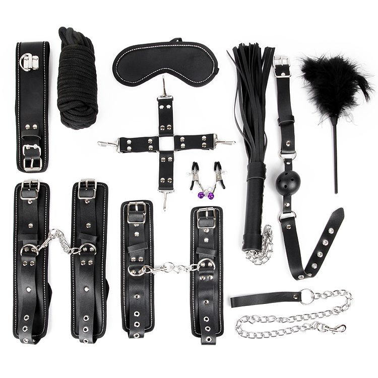 Великолепный набор аксессуаров для любителей БДСМ. В комплект входят наручники, оковы, ошейник с цепочкой-поводком, фиксатор, плеть, кляп, маска, верёвка, зажимы для сосков, щекоталка. Наручники, оковы, ошейник и маска снабжены специальной внутренней накладкой, предотвращающей натирание кожи. Также изделия имеют возможность регулирования размера. Зажимы для сосков украшены разноцветными бусинами, которые украсят грудь. Плеть-флоггер состоит из хвостов длиной и удобной рукоятки с металлическими вставками и петлёй для подвешивания на крючок, щекоталка – из удобной ручки и пушистых перьев. Кляп оснащён шариком с отверстиями для дыхания. Набор упакован в большую коробку. Длина хвоста флоггера - 24 см., рукояти - 15 см.