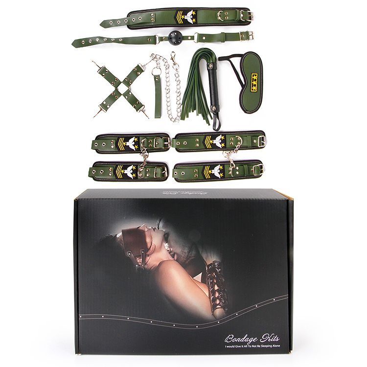 Великолепный набор аксессуаров для любителей БДСМ. В комплект входят наручники, оковы, ошейник с цепочкой-поводком, фиксатор, плеть, кляп, маска. Наручники, оковы, ошейник и маска снабжены специальной внутренней накладкой, предотвращающей натирание кожи. Также изделия имеют возможность регулирования размера. Плеть-флоггер состоит из хвостов и удобной рукоятки с металлическими вставками и петлёй для подвешивания на крючок. Кляп оснащён шариком с отверстиями для дыхания. Набор украшен декоративными накладками в военной тематике, упакован в большие красивые коробки.