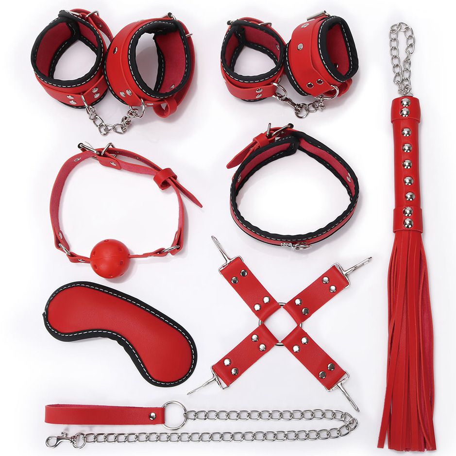 Великолепный набор аксессуаров для любителей БДСМ. В комплект входят наручники, оковы, ошейник с цепочкой-поводком, фиксатор, плетка, кляп, маска. Кляп, наручники, оковы, ошейник и маска снабжены специальной внутренней накладкой, предотвращающей натирание кожи. Также изделия имеют возможность регулирования размера. Плеть-флоггер состоит из хвостов и удобной рукоятки с металлическими вставками и петлей для подвешивания на крючок. Кляп оснащен шариком с отверстиями для дыхания.
