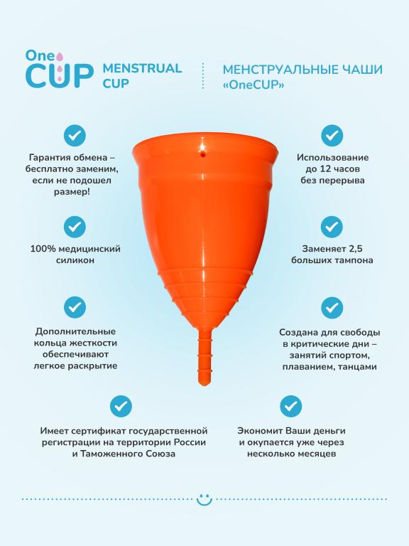Менструальная чаша OneCUP Classic – средство личной гигиены для многоразового использования в период менструации. Менструальные чаши OneCUP - единственные чаши в России, которые прошли необходимые исследования и испытания (в том числе токсикологические) и сертифицированы на территории России и стран Таможенного союза (Белоруссия, Казахстан, Армения, Киргизия). Это единственная чаша с реальной мировой гарантией – где бы покупатель ни приобрёл менструальную чашу OneCUP, если размер чаши ему не подойдет, то он может обратиться на официальный сайт бренда в течение 90 дней с момента покупки и ему бесплатно заменят чашу на другой размер. Менструальные чаши OneCup подходят женщинам с любым расположением шейки матки, рожавшим и не рожавшим, любого возраста. При производстве используется гипоаллергенный 100% медицинский силикон. Не содержит химических веществ, латекса, бисфенола, диоксинов. Веганский продукт, при исследованиях не испытывалось на животных. Преимущества: 1. В отличие от тампонов не впитывает, а собирает кровь – нет сухости, не нарушает микрофлору, не создает микроразрывов. Заменяет более 2,5 больших тампонов. 2. Не ощущается внутри - возможно использование до 12 часов без перерывов. 3. Легко устанавливается и раскрывается. 4. Вы можете плавать, спать, заниматься спортом, носить красивое белье – все комфортно и безопасно. 5. Чаша изготовлена из 100% медицинского силикона и не содержит никаких химикатов. 6. Конструкция чаши подходит для любого расположения шейки матки – просто скорректируйте длину хвостика во время использования. 7. При использовании отсутствуют запахи – ощущение свежести. 8. Конструкция упаковки позволяет точно убедиться, что коробка не вскрывалась. 9. Помогает экономить и окупается уже через несколько месяцев. 10. Помогает заботиться о природе, снижая загрязнение окружающей среды. Менструальная чаша OneCUP произведена в России, прошла полную сертификацию и получила Свидетельство Государственной Регистрации (СГР) - соответствует высочайшим стандартам качества. Производство сертифицировано по международному стандарту качества ISO 9001:2015. Линейка CLASSIC – используется силикон средней твердости, подходит для ежедневного использования. Размер S - для небольших и нормальных выделений. В комплекте: чаша, мешочек, подробная инструкция по применению на русском и английском языках. Длина тела чаши - 4,9 см., хвостика - 1,9 см. Объем - 24 мл.
