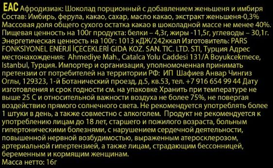 Натуральные ингредиенты, содержащиеся в шоколаде 48 hours gold, гарантируют вам и вашему партнёру невероятные моменты. Кроме того, вкус доставит бесконечное удовольствие. Продукты 48 hours gold - натуральные ингредиенты моментального действия для повышения потенции и яркого оргазма. Уникальность 48 hours gold в том, что продукт стимулирует сексуальную энергию как мужчин, так и женщин, повышая чувствительность обоих партнеров. Гарантированное действие 48 hours gold обусловлено высоким содержанием основного компонента - экстракта женьшеня. Женьшень во взаимодействии с другими компонентами улучшает микроциркуляцию, повышает либидо и обеспечивает устойчивую эрекцию. Продукт воздействует сразу и имеет пролонгированное действие , поэтому обеспечивает продолжительность полового акта и яркий оргазм партнеров.
