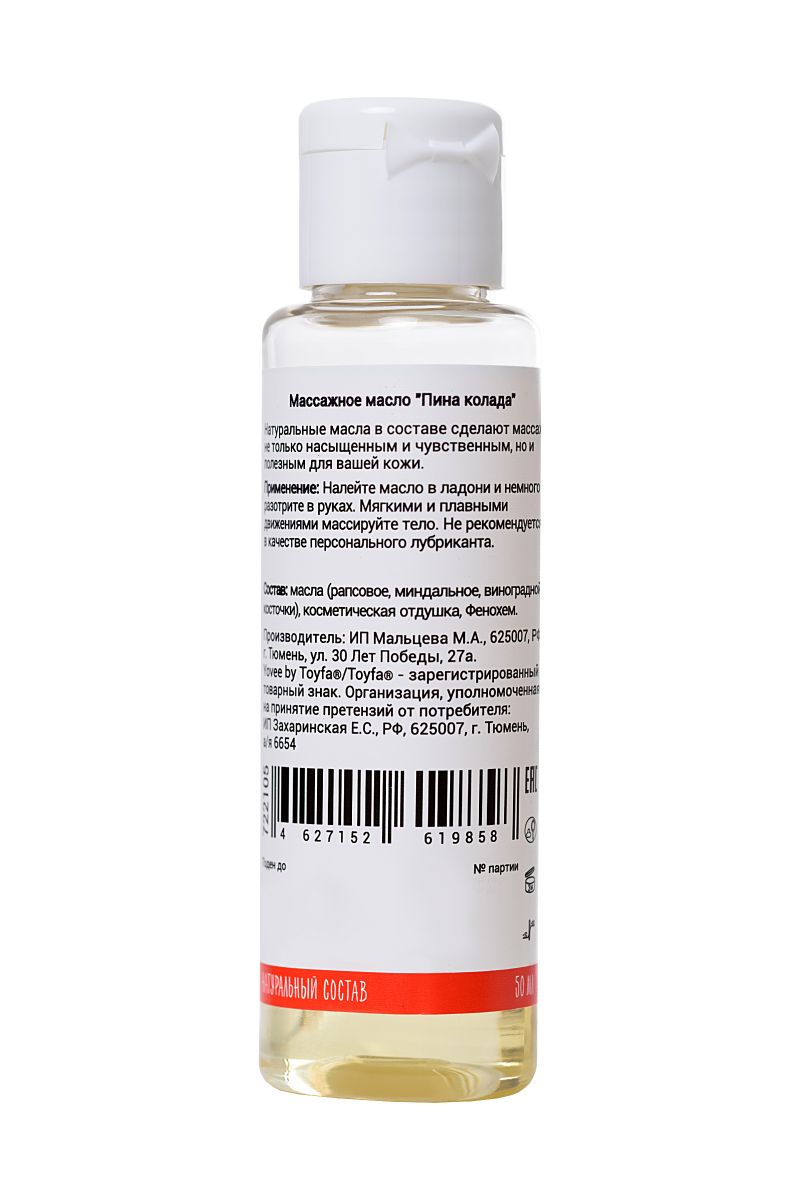 Натуральные масла в составе сделают массаж не только насыщенным и чувственным, но и полезным для вашей кожи. Отлично скользит и смывается водой. Тропический аромат коктейля Пина колада с лёгкостью расслабит и подготовит вас к чувственному массажу. Идея для свидания: приготовьте пару коктейлей Пина колада. Предложите партнёру расслабиться в ожидании массажа. Сделайте массаж своим обнажённым телом — так он станет ещё более интимным и чувственным. Такое свидание останется в памяти надолго!