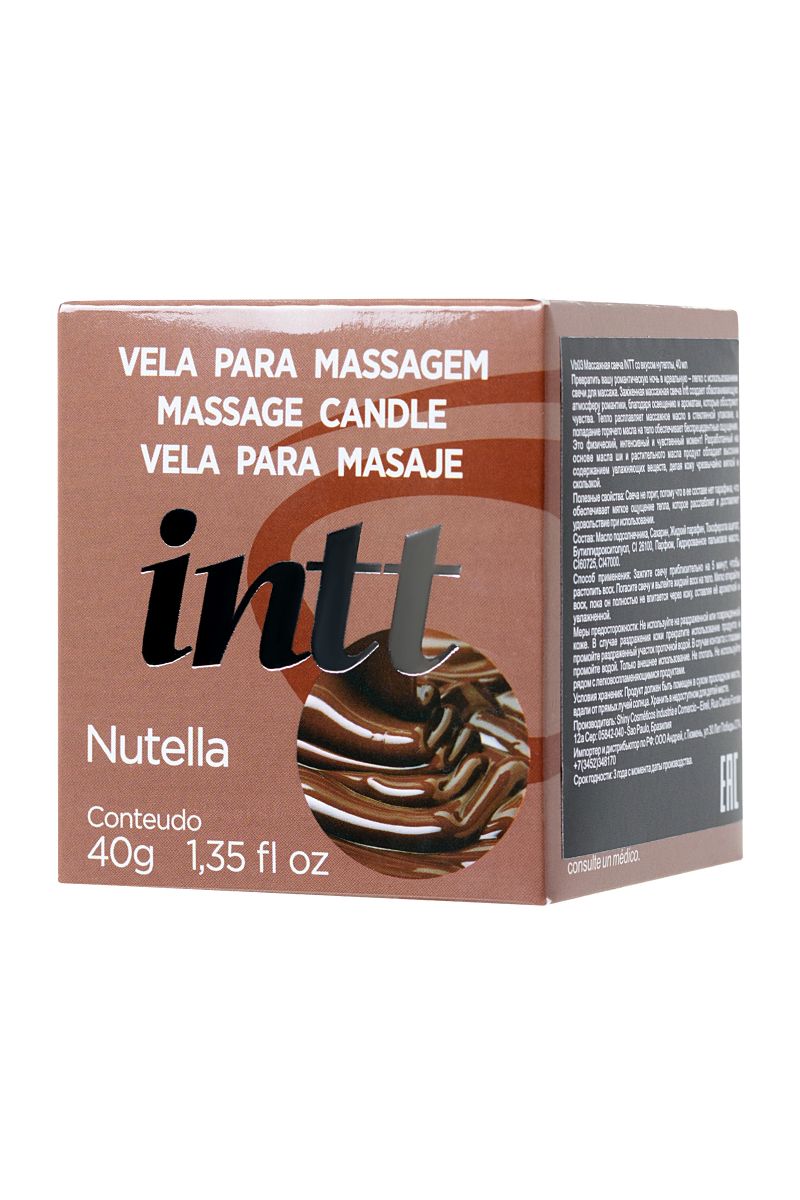 Запоминающийся массаж или горячая прелюдия? И то и другое, если в программе — массажная свеча для поцелуев Intt Nutella с ароматом «Нутеллы». Создает первоклассный антураж. Аромат сладкой «Нутеллы» наполняет пространство соблазном и задает настроение вечеру. Превращает обычный сеанс массажа в несравненный ритуал. Погасите свечу, и она превратится в растопленное массажное масло. Прикосновения теплых ладоней возбуждают и волнуют воображение. Открывает простор для сексуальных экспериментов. Восхитительный вкус «Нутеллы» позволяет вашим поцелуям и ласкам быть максимально будоражащими. Клинически протестированный дерматологами и гинекологами состав не обжигает и деликатно ухаживает за кожей.Откройте для себя новые оттенки страсти вместе с INTT.