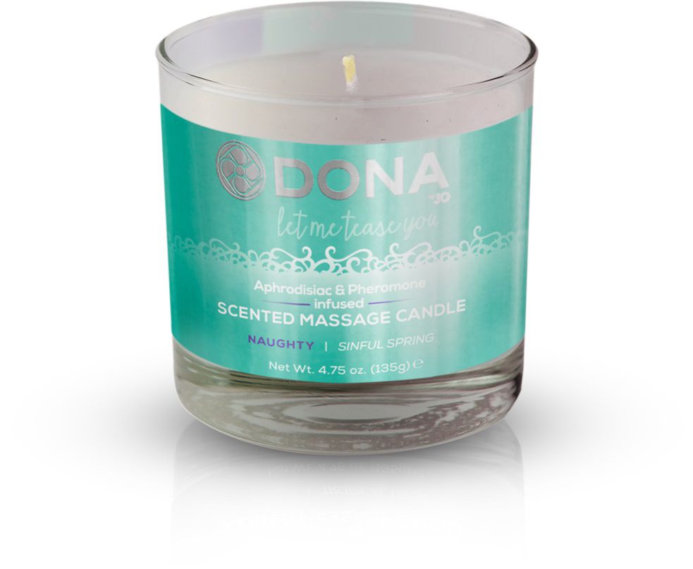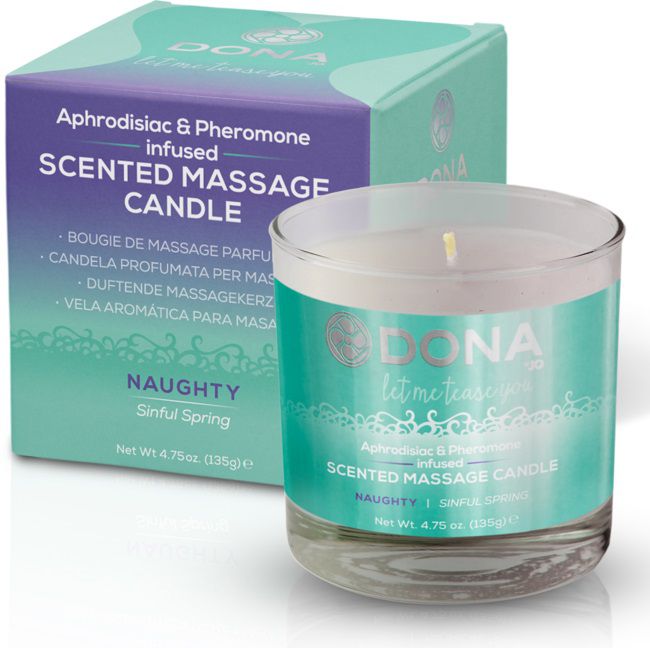 Массажная свеча DONA Scented Massage Candle Sinful Spring с весенним ароматом Naughty (пион, фиалка, миндаль, вербена) - необходимый атрибут романтического вечера. Нежное пламя и искрящийся оттенок создают эротический полумрак. Манящий аромат феромонов и афродизиаков витает в воздухе, пробуждая обоюдную неудержимую страсть. Всё помещение наполняется теплым опьяняющим ароматом желания. Подождите немного, пока растопится соевое масло, погасите пламя любви и на расстоянии от нежного тела, капните каплю волшебного тепла, и начинайте массаж. Массажные движения должны быть чувственными: поглаживания, растирания, лёгкие похлопывания.