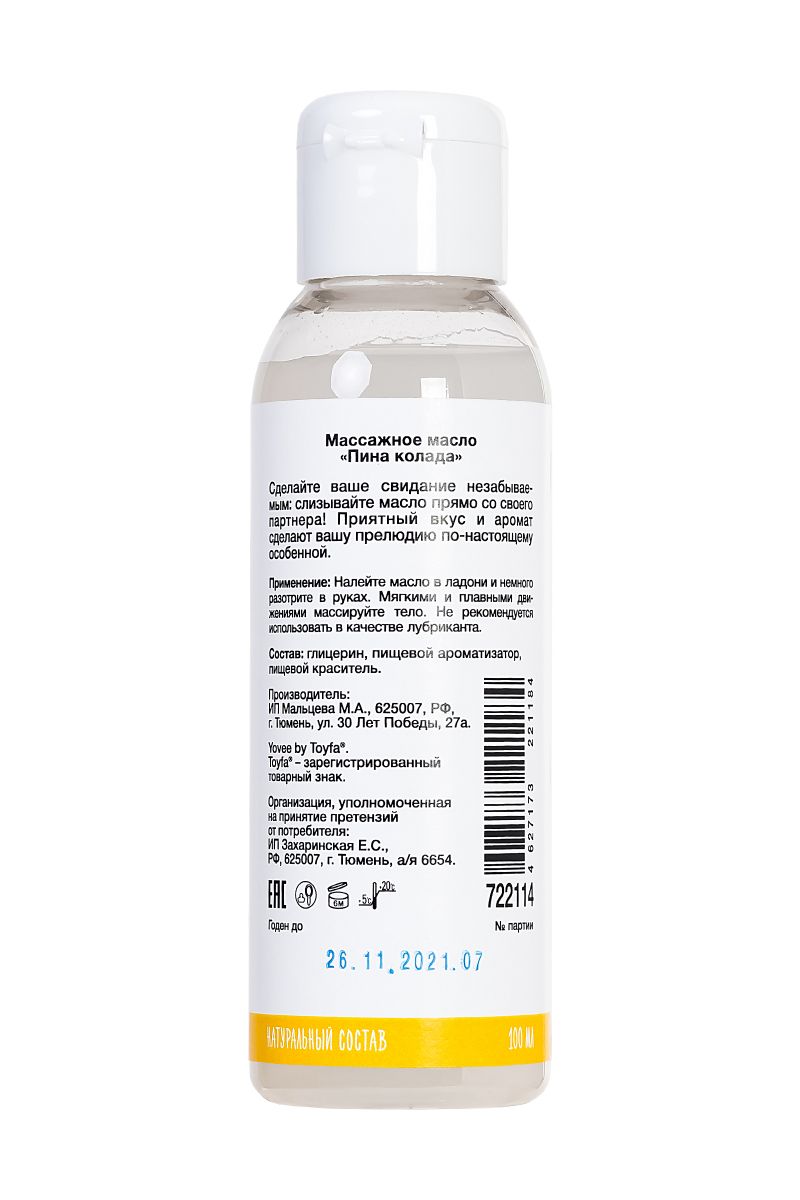 Массажное масло для полцелуев «Коктейль на десерт» Сделайте ваше свидание незабываемым: слизывайте масло прямо со своего партнера! С ароматным и вкусным массажным маслом, ваш партнер станет настоящим любовным коктейлем. Идея для свидания: Приготовьте пару коктейлей Пина колада и предложите партнеру незабываемый массаж. Лейте масло вдоль спины медленно, а затем начните слизывать приятное на вкус масло прямо с тела партнера. Такое свидание останется в памяти надолго!