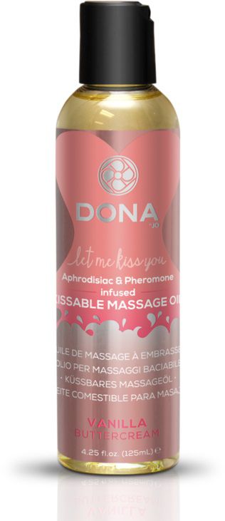 Массажное масло DONA Kissable Massage Oil Vanilla Buttercream с ароматом ванильного крема. Эротический массаж с маслом - это изысканный десерт на двоих. Расслабляйтесь и наслаждайтесь моментом удовольствия. Сбалансированная натуральная масляная основа и комплекс витаминов - Е, А, С, D позаботятся о нежной коже, делая её сияющей, ухоженной, гладкой и шелковистой. Нежирная и длительная формула - увлажняют и омолаживают кожу. Феромон снимает внутреннее напряжение, улучшает настроение и провоцирует сексуальное возбуждение. Продемонстрируй свою силу любви чувственными поглаживаниями, растираниями, шлепками или соблазнительными поцелуями воздействуя на вкусовые рецепторы страсти.
