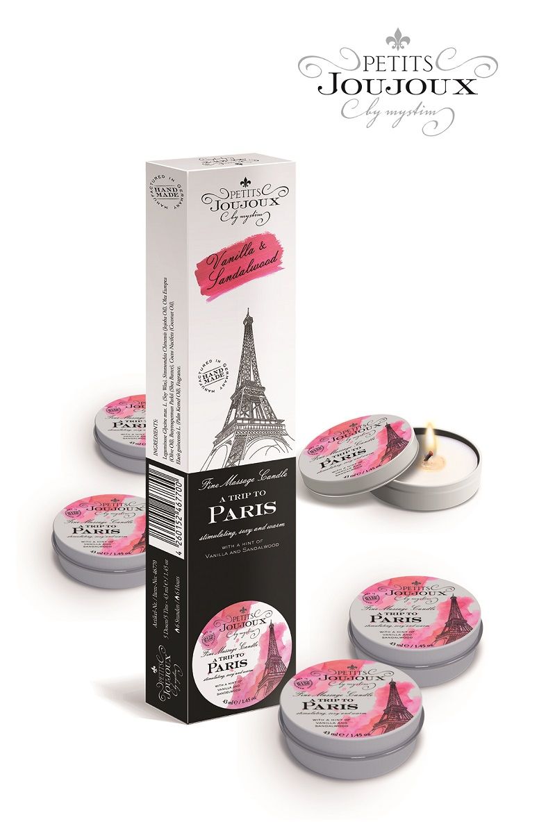 Чувственный массаж - лучшее начало эротического вечера! Просто подождите, пока массажная свеча расплавится и превратит воск в массажное масло, аромат Petits Joujoux Paris наполнит комнату свежестью, и наслаждайтесь волнующим массажем! Масло разогревается, но не обжигает - распаляя ваши тела и пробуждая желание! Воск на основе натуральных ингредиентов (масло жожоба, масло дерева ши, оливковое масло, кокосовое масло) прекрасно ухаживает за вашей кожей, увлажняет ее и придает телу приятный нежный аромат. Время горения каждой свечи - 6 часов. В упаковке 5 свечей по 33 гр. каждая.