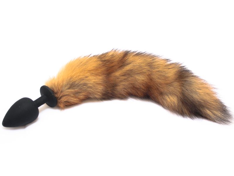 Чёрная силиконовая анальная пробка с рыжим хвостом размера L. Длина хвоста - 35 см. Вес - 90 гр.