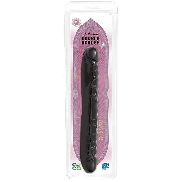 Двухсторонний фаллоимитатор черного цвета. Рельефный, с ярко выраженными венками, невероятно гибкий .