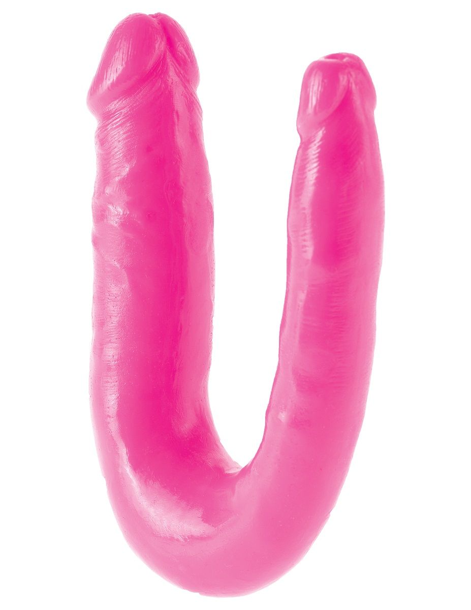 Ярко-розовый U-образный фаллоимитатор Double Trouble. Длина вагинального отростка - 11,4 см., диаметр - 3,2 см. Длина анального отростка - 10,8 см., диаметр - 2,5 см.