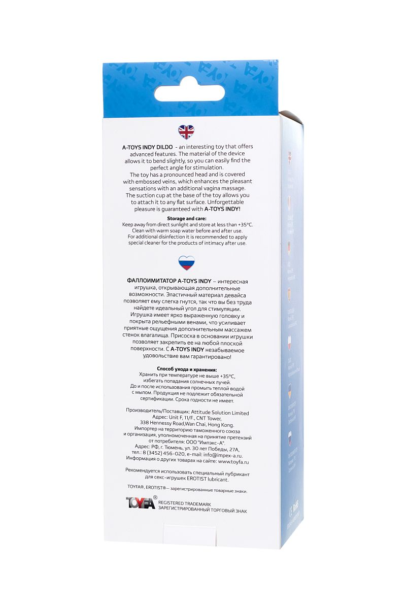Фаллоимитатор A-Toys Indy – интересная игрушка, открывающая дополнительные возможности. Эластичный материал девайса позволяет ему слегка гнутся, так что вы без труда найдете идеальный угол для стимуляции. Игрушка имеет ярко выраженную головку и покрыта рельефными венами, что усиливает приятные ощущения дополнительным массажем стенок влагалища. Присоска в основании игрушки позволяет закрепить ее на любой плоской поверхности. С A-Toys Indy незабываемое удовольствие вам гарантировано!