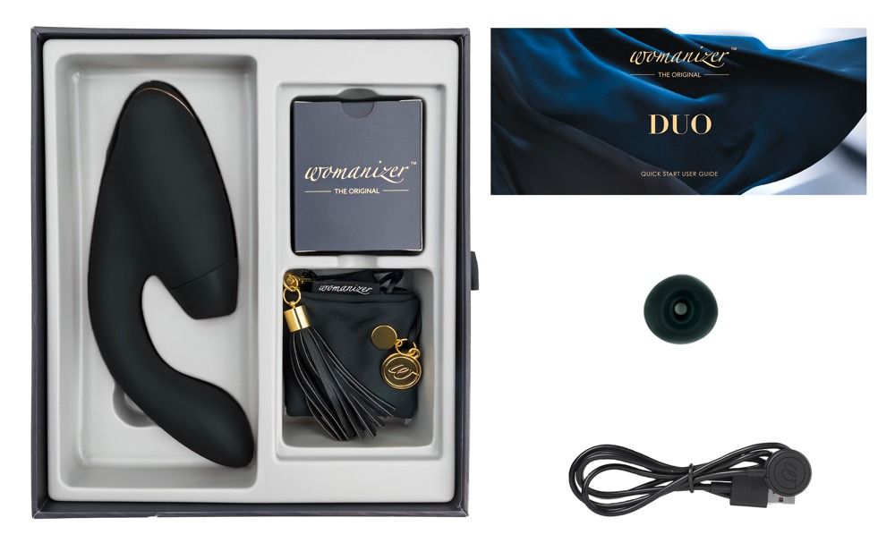 Неважно, являетесь ли вы взыскательной ценительницей удовольствий или просто ищете новых ощущений — Womanizer Duo поднимет Вас к вершинам оргазмических ощущений снова и снова благодаря принципу одновременной стимуляции. DUO имеет клиторальный стимулятор, выполненный в форме традиционного Womanizer – он мягко ласкает клитор с помощью технологии Pleasure Air. Кроме того, у DUO есть мощный вибратор, который адаптируется к форме Вашего тела, чтобы идеально стимулировать Ваши самые важные точки. 10 режимов вибрации и 12 скоростей. Рабочая длина отростка - 11 см., диаметр - 3,5 см.