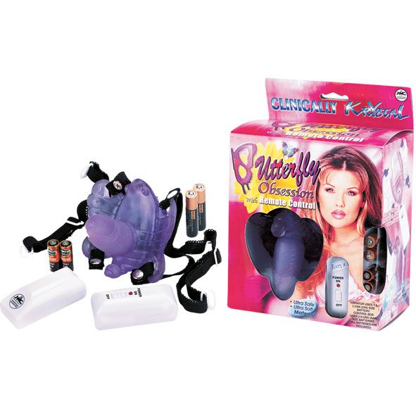 Клиторальный вибростимулятор на эластичных ремешках BUTTERFLY OBSESSION. Вибромассажер в виде бабочки с фаллоимитатором. Крепится к телу эластичными, регулируемыми ремешками. Мощный мини-электромотор с дистанционным пультом управления. Длина фаллоса - 5 см., диаметр - 2 см.