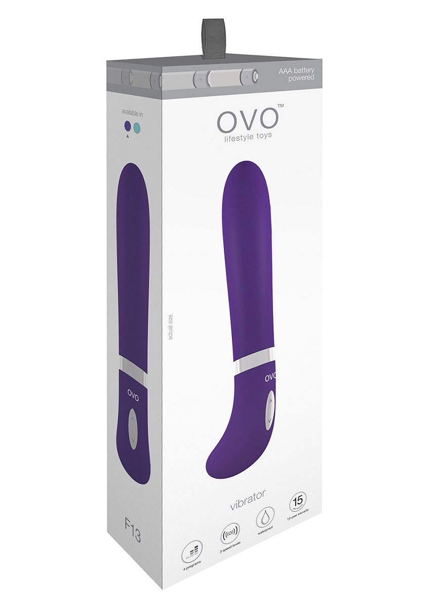 Вибратор OVO F13 фиолетового цвета выполнен в оригинальном минималистическом стиле из таких экологически чистых гипоаллергенных материалов, как силикон и анодированный пластик, которые приятны при прикосновении к телу. Изюминкой вибростимулятора является наличие удобной изогнутой ручки со встроенным в нее пультом управления. С помощью кнопок у вас есть возможность управлять интенсивностью вибрации, выбирая подходящую из 4 представленных программ и 3 уровней мощности. Гулкий рокот виброэлемента практически не слышен, но пробуждает каждую чувственную эрогенную зону.