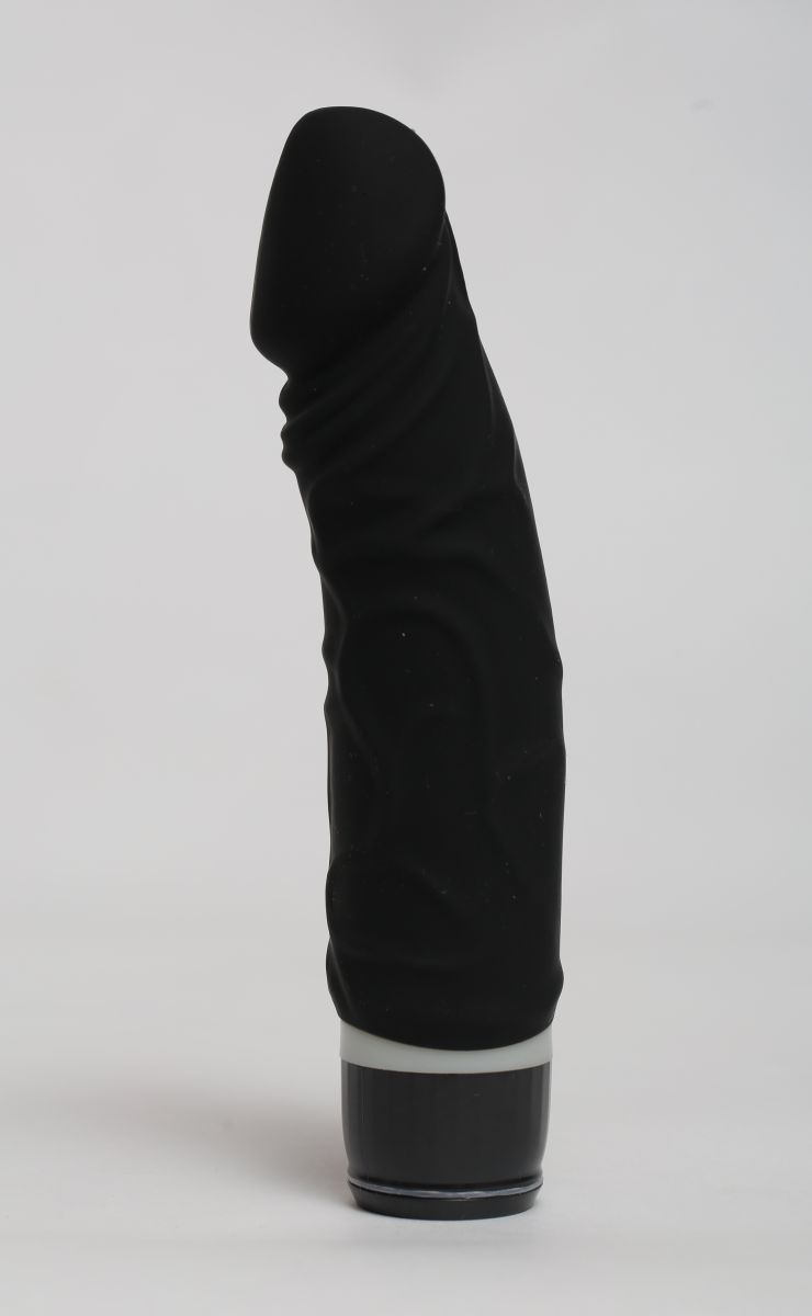 Вибромассажёр черного цвета. Имеет форму члена. Необычайно приятный, рельефный, выполненный из высококачественного силикона , передающий эффект мягкой реалистичной текстуры кожи, не имеет швов. Виброэлемент расположен по всей длине изделия. Вариации вибрации регулируются при помощи кнопки, расположенной в основании.